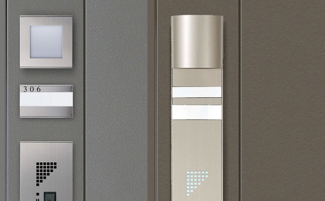照明(Bのみ)、室名札、インターホン、新聞受の機能を一体化したスリムなユニット。